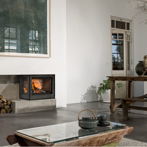 De inbouwkachel/- haard is voorzien van een glazen draaideur of liftdeur, waardoor het rendement een stuk hoger ligt dan het geval is bij een volledig open gestookte haard.